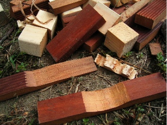 国産みの尊の呼びかけで、JLCのこどもたちが、夏休み中にマリンバを製作して、その他パーカッション類や歌と躍りとあわせて練習し、11月に天理教本部で行われるコンサートに参加することになった。尊の夢であった「自然塾楽団」結成である。その実現のために、Josephが「みんぱく」などで実施している、マリンバ製作と演奏のワークショップに出張して来てもらうことにした。マリンバを作るなどと簡単に言うが、私も彼等と演奏をともにして来たものの、そんなに簡単に行くものかと半信半疑だったが、やってみるとこれが出来るもんで、つまり上のような小さなマリンバなら、わりと簡単に作れるのである。要は角材を二本、厚めの板を二枚、上のように台形に組む。そこへロープを張って鍵盤になる硬い角材を並べ、音程を微調整した後に、紐で結わえれば良い。硬い角材は、ホームセンターなどで床材として売られているものの端切れで良い。それを大雑把に短いのから長いのまで切って行って、後は、近い音程になるように調整して行く。もちろん長ければ低いし、短ければ高い音がするのだが、マリンバとして、雑音や倍音のない、芯音を響かせるためには、下のように真ん中を削るのである。深く削れば削るほど、芯音は低くなり、同時に音程がはっきりして行く。だから、最初に角材を切り落とすときに、あまりに誤差の大きい長さにしてしまうと、第一工作が大変だし、他の鍵との音色のバランスが崩れるので、その見極めは大切だが、最初に作るのであれば、先ずは大雑把にやってみて、どんなもんか確かめるのも悪くない。鑿で真ん中を削って行くのだから、微妙なところへ来ると、つい削りすぎて音が低くなる。その時は、全体の長さを短くするか、あるいは両端を削ると、音程が上がるのである。真ん中を削るとき、全体を深く削るよりも、真ん中を集中的に深く削る方が、音程の下がり方が大きい。しかし、やりすぎると割れてしまう。微調整を終えれば、鍵の片方だけにひとつ穴を開けて、紐でかがってゆき、他方は穴をあけずに結わえるだけで良い。これで、鍵盤本体は完成する。さらに、その下に共鳴装置をつけたければ、基本的な考え方は、鍵盤と同じ長さの共鳴胴を付けるということだ。例えば、竹でも水道管でも良いし、台形の側面を持つ箱でも良い。共鳴装置が出来たら、ぜひともその側面の、鍵盤に近い一に穴を開け、ビビリ音を得るために、スーパーのレジ袋で良いから薄い膜を貼ることだ。そうすれば、音の広がりやしびれ具合が、ぐっと広がって快感を催す。