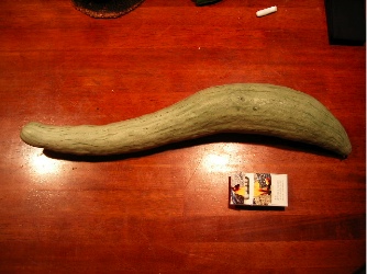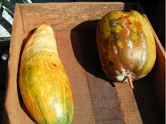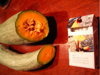 丸いカボチャは、何かと大き過ぎて勝手が悪いが、細長いカボチャは、小口から切って行けば、わりと長持ちするので重宝である。しかし、これは冬瓜の蔓に出来たものであって、いわば上の白ナがカボチャと兄弟であろうから、いつも必ずこうなるとは限らない。