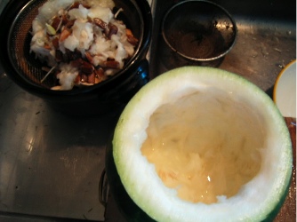 片付けるべきは他にもあって、これもヘチマか瓢箪かカボチャかわからぬのだが、切ってみるとカボチャ色をしている。