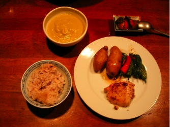 いくらなんでもデカイから、半分を天ぷら用に残しておいて、半分は牛乳と半々に煮てポタージュにしてやった。瓶詰めにして冷凍しておけば、何かの役に立つであろう。夕食は洋風に、そのポタージュと、鶏もも肉ステーキジャガイモの煮たものとししとうの炒め物添え、もうししとう全部激辛やった。