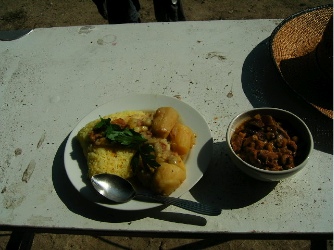 大豆をさやごと干していると、太陽に熱されて音をたててはじけるのである。それを集めていってからの莢は捨て、笊に広げてさらに干す。秋晴れの一日、せっかくだからこんな日は庭で昼飯にする。白サツマイモと数種類のインゲン豆のシチュー・ガルバンゾと茄子のキーマカレー・ターメリックライス・・・幸せ幸せ。