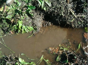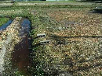 水は、田んぼから外に流れ出るので、田んぼの水を濁してやると、水の出口がわかる。その出口の、畦を挟んで反対側に必ず水が抜けている穴があるはずだ。これを捜すには、なるべく局所的に田んぼの水を濁す。そうすると、ある一点を濁したときに、どっと濁った水が外へ流れ出る。